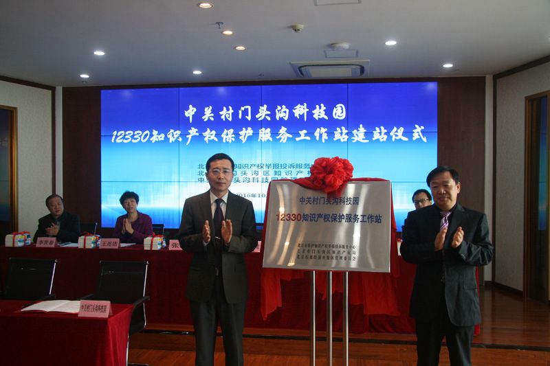 成立仪式上,北京市保护知识产权举报投诉服务中心(简称“北京12330”)与门头沟区知识产权局、石龙经济技术开发区管理委员会签署了工作站共建协议。北京市知识产权局副巡视员周立权、门头沟区区委常委、副区长张永共同为中关村门头沟科技园12330工作站揭牌。出席领导为园区“双创”企业代表赠送了由北京12330组织编写的《创业知识产权宝典》、《知识产权百题问答》等书籍资料。