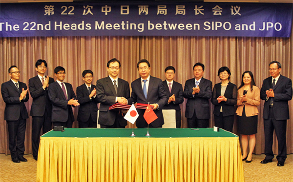 申长雨(前排右)与伊藤仁(前排左)出席第22次中日知识产权局局长会议